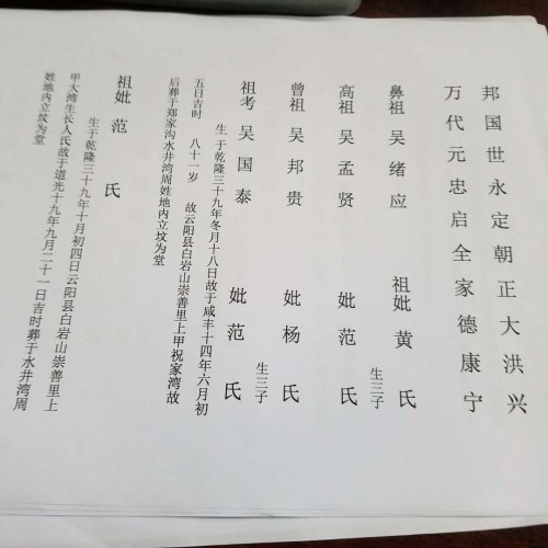 我支的老祖宗名叫吳國泰,生于乾隆三十九年冬月十八日。前面的支糸無記錄,是湖廣填川時由湖北麻城孝感高坎堰洗腳河進入重慶云陽縣白巖山居住的。 祖?zhèn)骼献V因失火而毀,現(xiàn)在譜記二十字輩是永字輩祖宗結(jié)合前祖輩口述再續(xù)的。