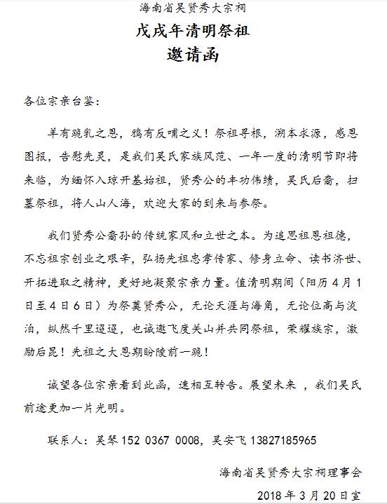 值清明期間(陽歷4月1日至4日6日),海南省吳賢秀大宗祠理事會(huì)舉行公祭活動(dòng),誠望各位宗親看到此文,速相互轉(zhuǎn)告。祖澤之流長因你歸來而不息,家聲之丕振緣你駕臨而愈宏!