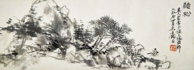 山水卷裝池于翌年,后載二十七家之二十八則題記。前二十二則為缶廬師友輩,先后為楊峴 (二則)、萬(wàn)釗、費(fèi)念慈、周星詒、高邕、凌霞、金爾珍、沈公周、章鈺、金爾珍、沈曾植、馬一浮、鄭孝胥、朱士林、王國(guó)維、陳三立、馮幵等二十一家。缶廬歿,其子?xùn)|邁又延請(qǐng)諸宗元、冒廣生、夏敬觀、沈劍知、吳湖帆五家題記。后又有藏家屬筆者題跋一則,總計(jì)二十八則。吳氏將此山水卷裝池后,至其下世前三十四年里,多次攜卷外出求題,若非自創(chuàng)之妙品,豈能珍重如此。況其時(shí)吳昌碩與王一亭尚無(wú)交際據(jù)考吳、王相識(shí)當(dāng)在1909年3月,即在繪成此卷之十七年后,不存在由王一亭代筆可能。書(shū)法家、金石家楊峴在題跋中稱:“昌碩仁弟自畫山水八紙,裝治成卷。癸巳 (1893)秋七月下榻敝齋,出視率題。”高邕的題跋更指出此卷是作于其畫室,跋稱:“缶廬金石家,五十學(xué)山水。昨在李盦中,一揮得八紙。天生橫行筆,今古皆不是。闖入大滌堂,嚇得石濤死。”又謂:“蒼公今年忽畫山水,此卷不學(xué)石濤而有石濤韻度,展玩數(shù)過(guò),乃知此老胸中未易窺測(cè)。癸巳十月,高邕題于上海。”證據(jù)鑿鑿,可知吳氏是工于山水的,且具有不凡的水準(zhǔn)。附帶指出,國(guó)內(nèi)有兩家博物館藏有雙胞胎的“聽(tīng)松圖”。曾有此是彼非的爭(zhēng)辯,而以拙文所刊出之 《聽(tīng)松圖》(見(jiàn)刊頭圖) 及其款題考鑒,可知“雙胞胎”者,兩無(wú)一真,皆為依樣仿造的贗品。