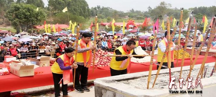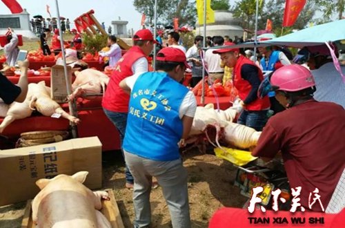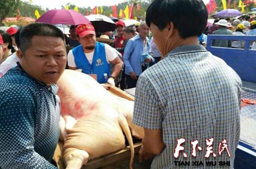 圖為工作人員幫忙搬豬,看是有點(diǎn)吃力?,F(xiàn)場(chǎng),不少運(yùn)送肥豬肉的三輪車被貼上拉豬專用車,方便工作人員的識(shí)別和指揮?,F(xiàn)場(chǎng)目測(cè),貢品區(qū)有近百頭大肥豬被一字排開堆放在臺(tái)上,形態(tài)各異,非常壯觀。這些肥豬,輕則100多斤,重則近300斤;至少需要4-6個(gè)人才可以搬動(dòng),非常吃力。