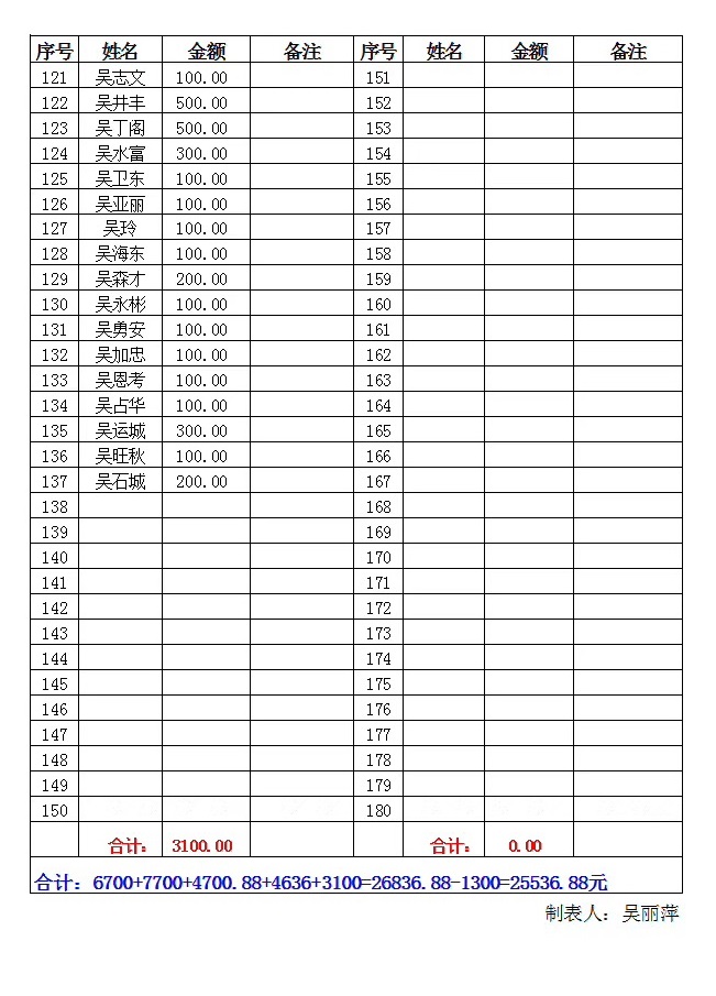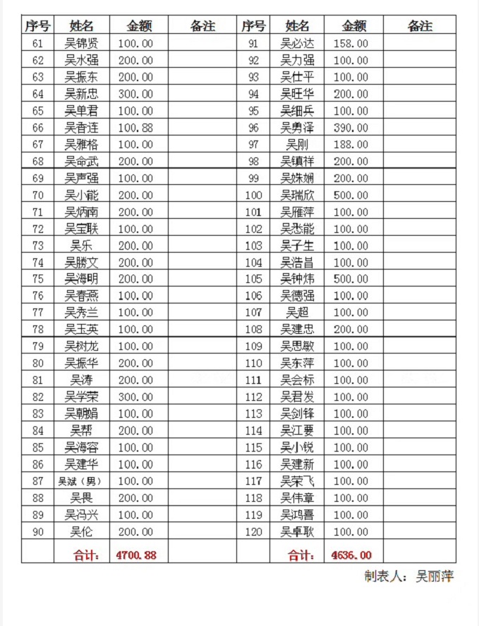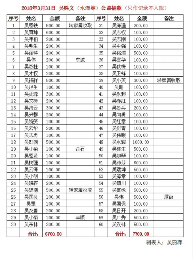 注:捐款活動(dòng)結(jié)束后,吳石城宗親捐來人民幣200元,吳旺秋宗親捐來人民幣100元,吳新強(qiáng)宗親捐來人民幣200元,吳育龍宗親捐來人民幣100元,己轉(zhuǎn)入?yún)莿倭x家屬賬戶。