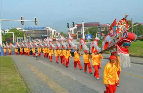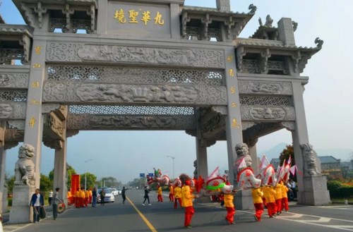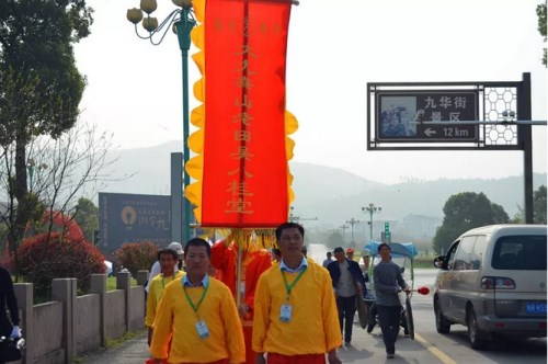 4月1日下午三時許,100余人組成的龍燈、鑼鼓、堂旗等隊伍,在九華山老田吳氏總會吳海祥的帶領(lǐng)下,浩浩蕩蕩來到大九華山”九華圣境“大牌坊下迎接南京浦吳氏宗親。