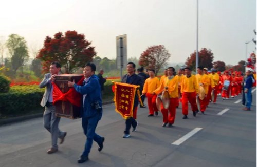 4月1日下午三時(shí)許,100余人組成的龍燈、鑼鼓、堂旗等隊(duì)伍,在九華山老田吳氏總會(huì)吳海祥的帶領(lǐng)下,浩浩蕩蕩來(lái)到大九華山”九華圣境“大牌坊下迎接南京浦吳氏宗親。