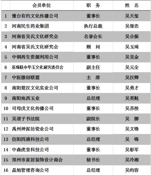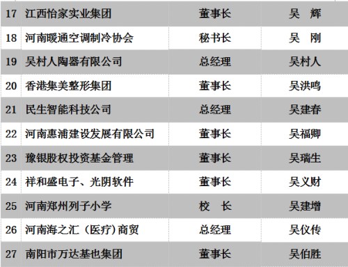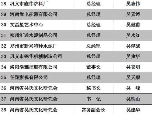 2018年4月2日,河南吳氏企業(yè)30多位負(fù)責(zé)人在鄭州鄭州天鵝城國(guó)際飯店會(huì)議室召開(kāi)了首屆河南吳氏企業(yè)發(fā)展研討會(huì),因是首次嘗試,本次會(huì)議只邀請(qǐng)部分吳氏企業(yè)家(要求有一定規(guī)模的實(shí)體企業(yè)和產(chǎn)品,有文化傳承和發(fā)明創(chuàng)造),以及河南省吳氏會(huì)的現(xiàn)職領(lǐng)導(dǎo)進(jìn)行坐談研討,規(guī)??刂坪苄?。通過(guò)本次研討會(huì)河南吳氏緊密結(jié)合國(guó)家姓氏文化戰(zhàn)略,樹(shù)立大國(guó)意識(shí)、大姓意識(shí)、中原主導(dǎo)意識(shí),開(kāi)創(chuàng)河南吳氏企業(yè)互助、共享、開(kāi)拓的嶄新局面,以“走進(jìn)新時(shí)代、實(shí)現(xiàn)新作為”為目標(biāo)。