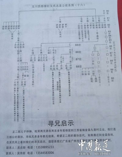 【尋根啟示】正二郎兒子仲紳、旺榮兩兄弟在兩百多年前移居到江西省瑞金縣九堡村立業(yè),我們是三郎公的裔孫,尋找兄弟多年都無結(jié)果,希望正二郎的裔孫后代,如果搬遷到全國各地,在吳氏網(wǎng)上看到我們的尋兄啟示,請聯(lián)系我們廣東省廣州市花都區(qū)獅嶺鎮(zhèn)益群合境村聯(lián)系人:吳炎新電話:13538895233聯(lián)系人:吳偉新電話:13544583006