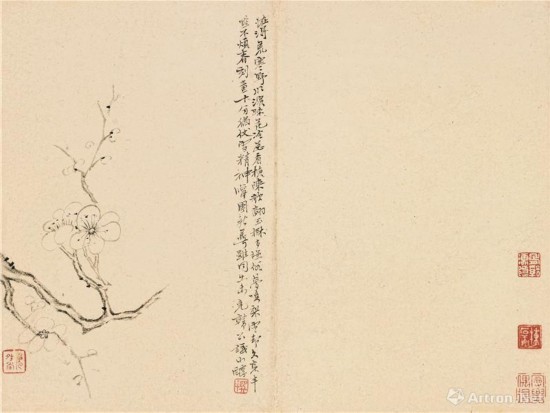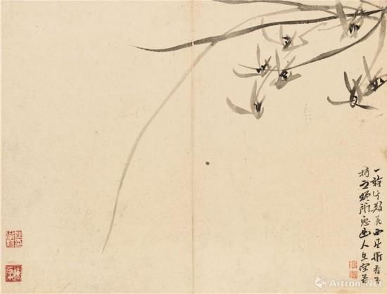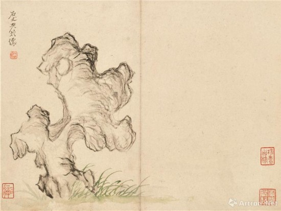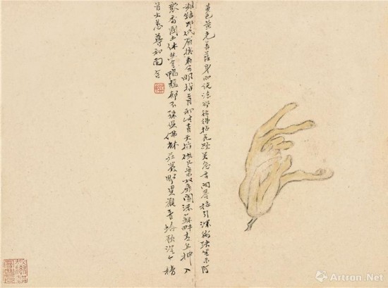 陳撰(1678—1758)浙江人人,早年受業(yè)于毛奇齡,詩(shī)文書(shū)畫(huà)俱工,又精于碑版古籍之鑒定。中歲流寓揚(yáng)州。他為人清高,不輕易為人作畫(huà),故有“每紙落人間,珍若拱璧”之謂。傳世作品不多,且大都為冊(cè)頁(yè)小品。蕭平老師認(rèn)為,陳撰是“八怪”中畫(huà)筆最為簡(jiǎn)略的一人,往往僅在紙素一角作畫(huà),留其大部空白,屬于純粹的文人墨戲。