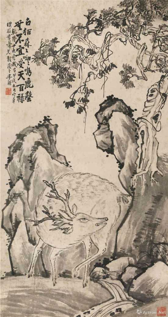 李鱓 《古柏鳴鹿圖》軸 142×76cm 紙本水墨