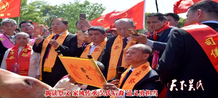 中華吳氏宗親總會(huì)吳文富主席任總主祭。世界至德總會(huì)名譽(yù)主席、無(wú)錫市榮譽(yù)市民吳天賜先生,世界至德總會(huì)主席吳希民先生,無(wú)錫新吳區(qū)泰伯陵吳文化交流協(xié)會(huì)會(huì)長(zhǎng)華伯泉先生,菲律賓讓德吳氏宗親總會(huì)理事長(zhǎng)吳俊民先生,香港泰伯基金會(huì)首屆會(huì)長(zhǎng)吳海鏞先生,安徽福建商會(huì)會(huì)長(zhǎng)吳端革先生,安微豪丹集團(tuán)董事長(zhǎng)吳義平先生,晉江市磁灶商會(huì)會(huì)長(zhǎng)吳聲團(tuán)先生任主祭。菲律賓讓德吳氏宗親總會(huì)執(zhí)行副理事長(zhǎng)吳啟發(fā)先生等海內(nèi)外吳氏社團(tuán)代表任陪祭,中華吳氏宗親總會(huì)秘書(shū)長(zhǎng)吳謹(jǐn)程任司儀。