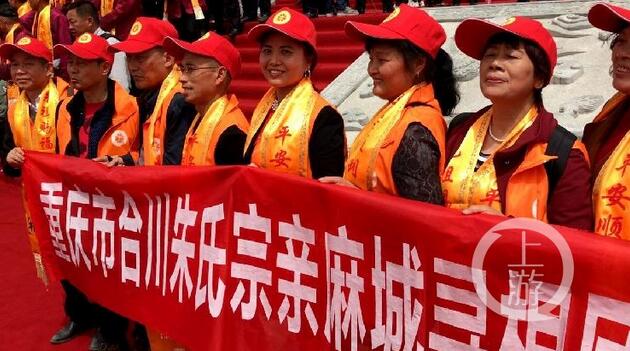 來自重慶合川的朱氏家族一行12人在活動祭祖大典門前拉著“重慶合川朱氏宗親麻城尋根團(tuán)”的條幅合影留念,與其他姓氏不同的是,和他們一起合影的還有麻城當(dāng)?shù)刂焓系闹旖鹈?。他們?012年從重慶合川尋根到了湖北麻城,并成功續(xù)上了族譜。