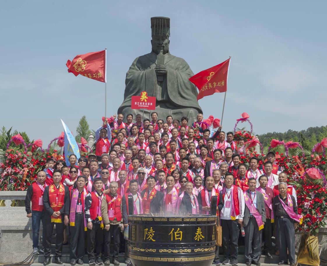 圖為浙江吳氏祭祖團(tuán)在泰伯塑像前合影留念