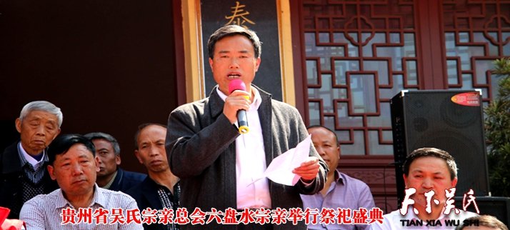 貴州省吳氏宗親總會會長吳學(xué)強(qiáng),開陽縣吳氏宗親分會會長吳天友,執(zhí)行會長吳肇俊等應(yīng)邀參加了此次盛會,為期一天的祭祀,民族文化交流會,由貴州省吳氏文化研究中心,六盤水吳氏宗親文化研究分會主辦這次活動。省總會會長吳學(xué)強(qiáng)在會上講話中指出,怎樣發(fā)展吳氏文化、經(jīng)濟(jì),怎樣才能盡早讓家人們脫貧奔小康,必須認(rèn)真貫徹習(xí)總書記的十九大講話精神,牢記使命,做好“一帶一路”工作。全場響起了熱烈的掌聲。