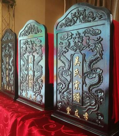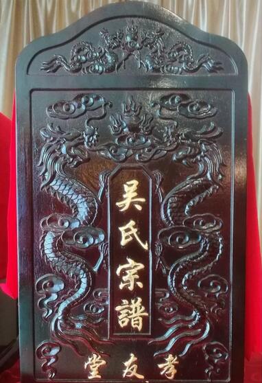 新修的譜書(shū)裝在木質(zhì)盒子里。盒子正面雕刻著祥云和兩條龍,還刻有“吳氏宗譜“、“孝友堂“金色大字。盒子上面披蓋著紅綢布。顯得莊重、大氣、典雅。每位請(qǐng)譜者,先向三圣公像三鞠躬,再像譜書(shū)三鞠躬,然后將裝著譜書(shū)的木盒子雙手捧著下去。