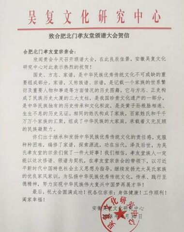 孝友堂副會(huì)長(zhǎng)吳大求致歡迎辭,修譜委員吳大傳、高翠華分別向大會(huì)報(bào)告了修譜工作情況和財(cái)務(wù)情況,九華山老田吳宗親理事會(huì)會(huì)長(zhǎng)吳海祥講話,合肥前份三讓堂宗親理事會(huì)副會(huì)長(zhǎng)吳文淵講話,孝友堂無(wú)為、山東宗親代表講話。然后舉行隆重的頒譜儀式。