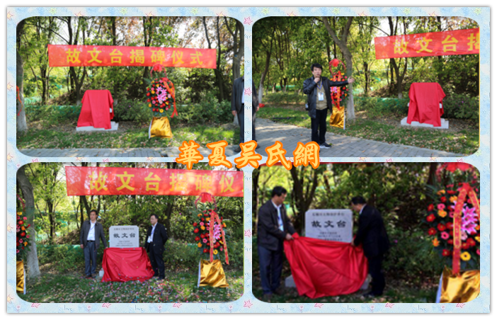 當(dāng)天,無(wú)錫市文物保護(hù)單位——“故文臺(tái)”也正式揭碑面世。“故文臺(tái)”,在梅村西南四華里許,即:距離現(xiàn)在的梅村街道中心不到2公里。據(jù)記載,泰伯定都梅里后,因“荒三千”是他的發(fā)祥地,就在中央筑一“文臺(tái)”,占田兩畝許,高約十多米,是一孤立之土丘。每年春播第一天,泰伯就登臺(tái)慶典,朝拜天地,祭祀祖先,並檢閱臣民,預(yù)祝年內(nèi)風(fēng)調(diào)雨順、國(guó)泰民安。闔閭遷都姑蘇后,亦筑一臺(tái),仍名“文臺(tái)”。荒三千的文臺(tái)逐漸荒蕪,稱“故文臺(tái)”。
