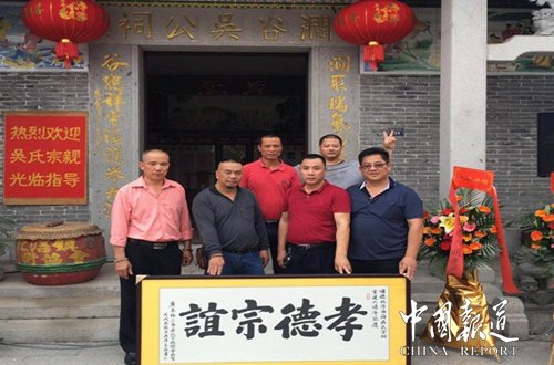 順德北滘西海澗谷吳公祠重建6周年慶典活動(dòng)是由吳玲裕宗長(zhǎng)主持;參加這次活動(dòng)的宗親有100多人;其中,珠三角吳氏宗親總會(huì)成員有:常務(wù)副會(huì)長(zhǎng)吳占標(biāo)、吳鎮(zhèn)添,副秘書(shū)長(zhǎng)吳偉寧等。在活動(dòng)期間,吳錦添會(huì)長(zhǎng)一行參觀了順德北滘西海吳氏宗祠,向他們贈(zèng)送了《孝德宗誼》字畫(huà)。