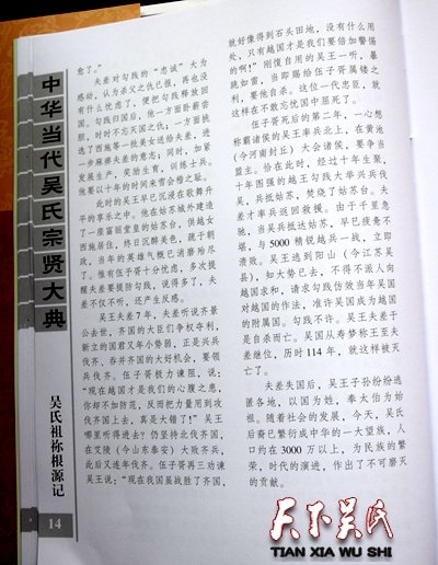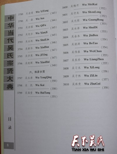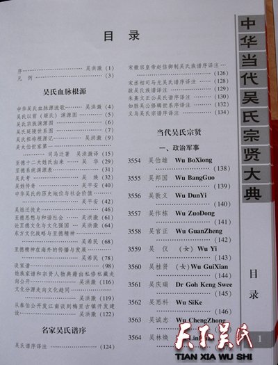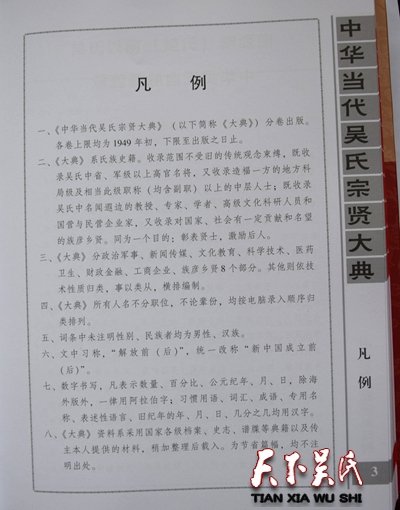 《大典》系吳氏家族史籍。收錄范圍不受舊的傳統(tǒng)觀念束縛,既收錄吳氏中省軍級以上高官名將,又收錄造福一方的地方科局級及相當此級職稱(均含副職)以上的中層人士;既收錄吳氏中名聞遐邇的教授、專家、學者、高級文化科研人員和國營與民營企業(yè)家,又收錄對國家、社會有一定貢獻的族彥鄉(xiāng)賢,同為一個目的:彰表賢士,激勵后人。