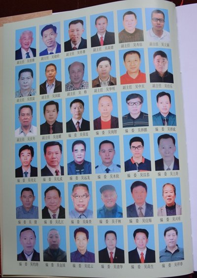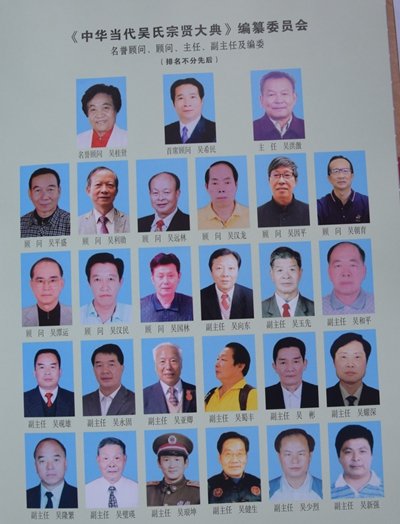 本《大典》名譽顧問:吳桂賢(原中共中央政治局候補委員、國務院副總理),首席顧問:吳希民(博士、世界至德宗親總會主席),編委會主任、主編:吳洪激(教授、史學家、新聞出版編審、世界至德宗親總會常務副主席),編委會副主任、副主編共計63名參與編纂。