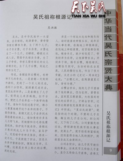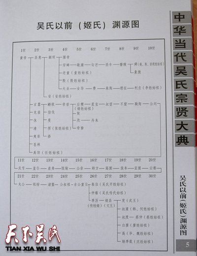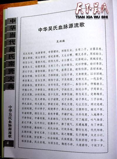 吳氏,乃中華民族中一大望族。吳氏文化源遠流長,博大精深,內(nèi)涵豐富,外延寬廣。在數(shù)千年的發(fā)展中,涌現(xiàn)了一代又一代名流精英,以自己的智慧、勇敢、勤勞與血汗在政治軍事、新聞傳媒、文化教育、科學技術、財政金融、醫(yī)藥衛(wèi)生、工商企業(yè)等各行各業(yè)中做出了前所未有的輝煌業(yè)績,譜寫了氣勢恢宏、蕩氣回腸的壯麗人生。正是這些杰出的吳氏兒女,在社會的各個領域、歷史的各個時期起著舉足輕重的作用,對祖國的繁榮發(fā)展、民族的團結演進作出了不可磨滅的貢獻,已成為國家的寶貴財富和民族的精神支柱。在昌明盛世的今天,我們應該記載他們,為他們立傳,并以當代大文化、大信息加以宣揚與傳播?!吨腥A當代吳氏宗賢大典》就是基于此而編繤出版的,它是檢閱當代吳氏名流精英的業(yè)績,架起聯(lián)系海內(nèi)外吳氏宗親的橋梁;亦是宗譜的補充,國史的參證。