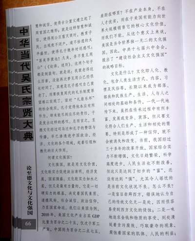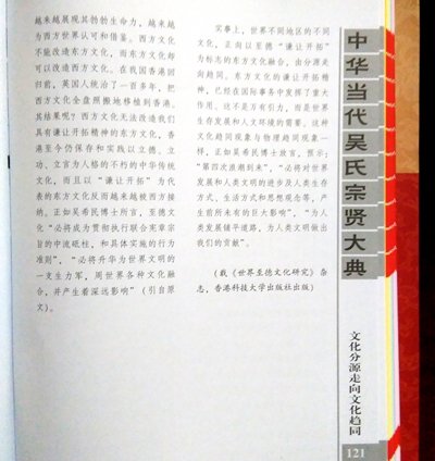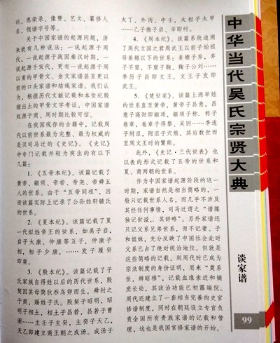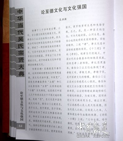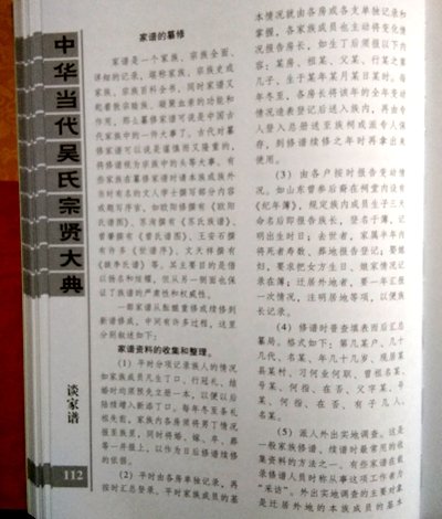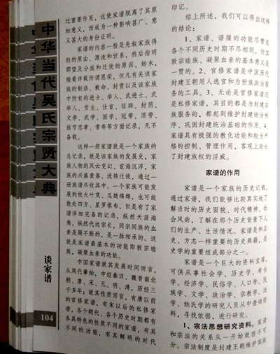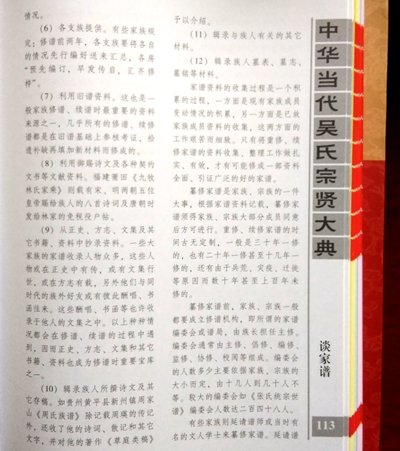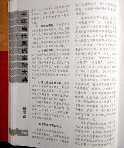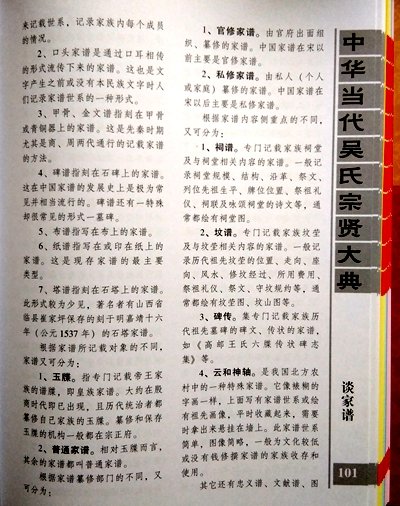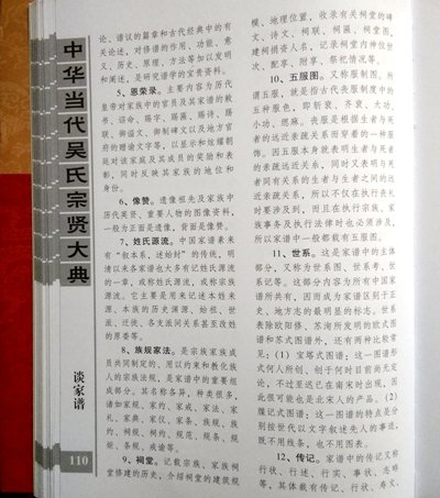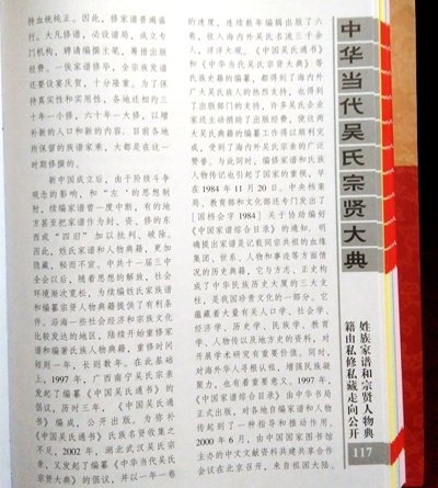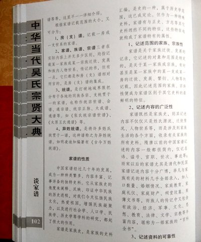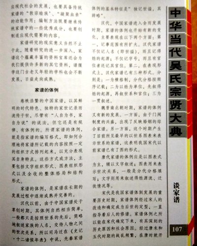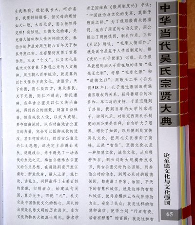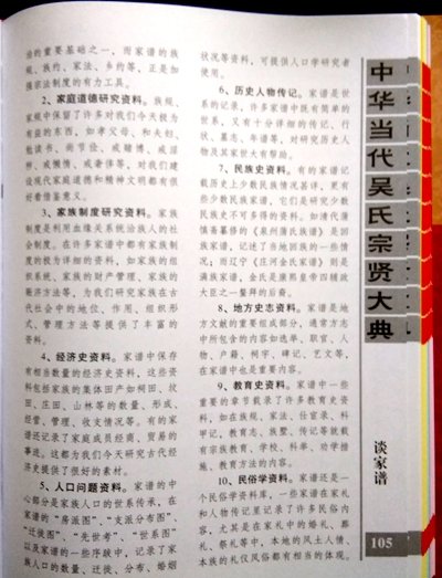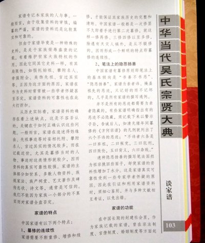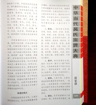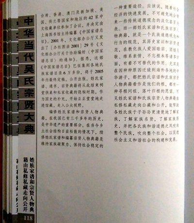 《大典》系吳氏家族史籍。收錄范圍不受舊的傳統(tǒng)觀念束縛,既收錄吳氏中省軍級以上高官名將,又收錄造福一方的地方科局級及相當此級職稱(均含副職)以上的中層人士;既收錄吳氏中名聞遐邇的教授、專家、學者、高級文化科研人員和國營與民營企業(yè)家,又收錄對國家、社會有一定貢獻的族彥鄉(xiāng)賢,同為一個目的:彰表賢士,激勵后人。