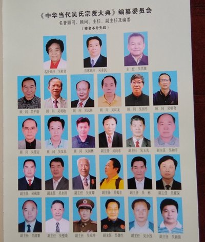 本《大典》名譽顧問:吳桂賢(原中共中央政治局候補委員、國務院副總理),首席顧問:吳希民(博士、世界至德宗親總會主席),編委會主任、主編:吳洪激(教授、史學家、新聞出版編審、世界至德宗親總會常務副主席),編委會副主任、副主編共計63名參與編纂。