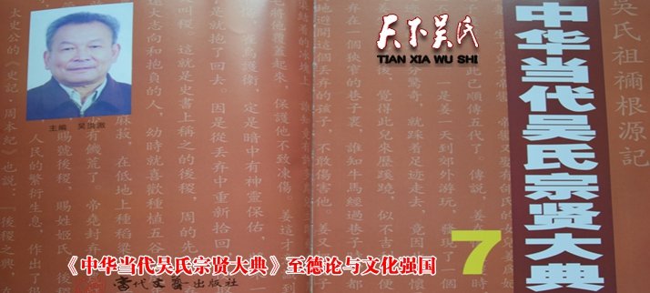 據(jù)《中華當代吳氏宗賢大典》主編吳洪激介紹,期待已久的《中華當代吳氏宗賢大典》第七卷已正式由當代文藝出版社于2018年4月第一版出版,該書共385頁,內容豐富,圖文并茂。 《中華當代吳氏宗賢大典》(以下簡稱《大典》),自2002年以來,陸續(xù)編輯出版了7卷,收錄了政治軍事界、新聞教育界、科學技術界、醫(yī)藥衛(wèi)生界和各地族彥鄉(xiāng)賢等3810人。已被國家圖書館、檔案館收藏,傳諸后世。大典彌補了宗譜之不足,在海內外影響很大。