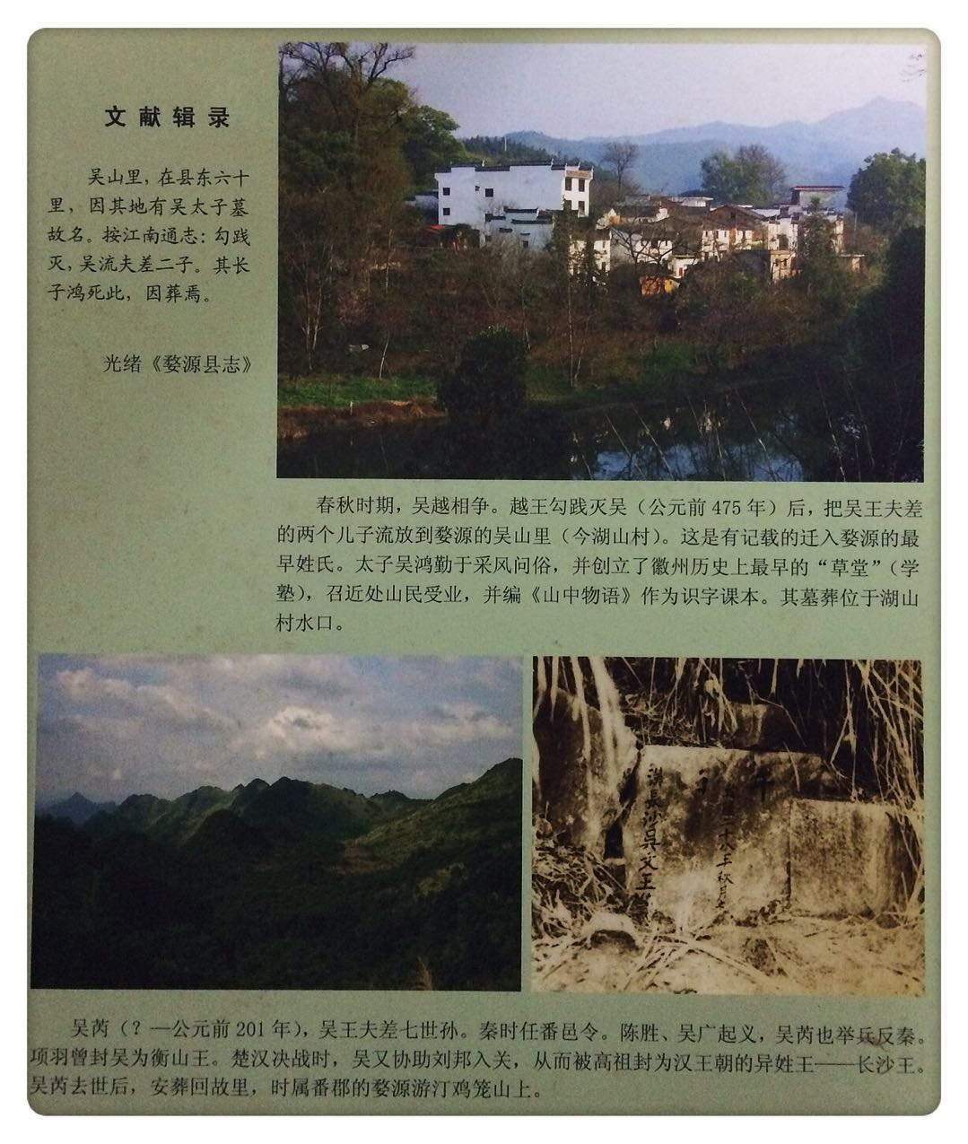 鄉(xiāng)人不知吳太子(鴻),兩過江灣亦無緣;博物館里三二句,幾經(jīng)百度才知——吳王夫差的二位王子,流落在婺源江灣鎮(zhèn)湖山村。西面是朱熹故里紫陽(紫色東來,艷陽高照)鎮(zhèn),江主席祖籍在江灣。