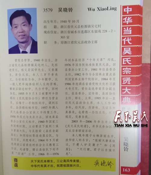 吳曉鈴,出生年月:1940年10月,祖籍:浙江省慶元縣松源鎮(zhèn)吳宅村,現(xiàn)在住址:浙江省麗水市蓮都區(qū)東銀苑228-2-303室,職務:原浙江省慶元縣政協(xié)主席,曾用名學賢,1940年出生,浙江省慶元縣松源鎮(zhèn)吳宅村人。先祖進貢元,祖父是國學先生,父親廩生,棄仕從農。本人三歲不幸喪父,與母相依為命。少年輟學,比一般人更早地體驗到人生的苦難。解放后讀過初中,無力升學,回村務農。1955年5月5日被曹坪鄉(xiāng)供銷社(農民股份合作)聘任為營業(yè)員。后緣于一手鋼板刻字,調到區(qū)社、縣供銷社秘書股。1957年調入慶元縣委辦公室做文書檔案工作。1958年慶元與龍泉并縣,回龍泉縣委辦公室任文秘書。1960年國家三年困難時期,主動要求下派到三溪鄉(xiāng)黃南大隊,與吳報榮(縣農業(yè)副局長)和周培權等改造落后隊。與民同苦,共度難關。1964年5月被選調浙江省委農村社會主義教育工作團,赴諸暨、縉云縣駐隊下村開展“四清”工作。1966年—1976年回本縣經歷“十年文革”內亂。1976年國務院批準恢復慶元縣,回縣委辦公室工作。1981年任縣委辦主任,1982年作為全國林業(yè)重點縣到國家林業(yè)部干校培訓。1984年至1986年選調在省委黨校文化補習獲大專文憑。曾任縣選舉委員會副主任。在縣委辦、宣傳部、縣政協(xié)任主任、部長、主席。1995年后一直任慶元縣政協(xié)主席。本人工作40多年,經風雨,歷磨難,見證各種真善美,也看透一些假丑惡,反思現(xiàn)實,完善自我。2003年—2006年參與并主編《慶元吳氏統(tǒng)譜》,并多次參加國內吳氏宗親聯(lián)誼活動。本人晚年隨子女棲居麗水市,欣仰前人的名言:“能耐天磨真鐵漢,不遭人妒是庸才”和《周易》:“天行健,君子以自強不息”。天下吳氏本根生,三讓高風傳美德;中華代有英才出,祝愿祖國振興日。