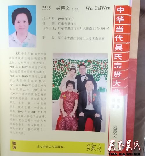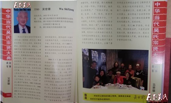 吳世雄,出生年月:1933年9月10日,祖籍:浙江杭州臨安區(qū)板橋鎮(zhèn)牌聯(lián)村水邱塢 現(xiàn)在住址:浙江省嘉興市南湖區(qū)新興街道西麗社區(qū)西園里5幢502室,職務:浙江省嘉興市政府離休干部。我出生于浙江省杭州市臨安區(qū)(原為縣)板橋鎮(zhèn)(原為鄉(xiāng))牌聯(lián)村水邱雞一個小山溝里,初級師范肄業(yè),在家務農一年。解放后,于1949年6月底參加剿匪部隊——解放軍75師311團后勤供給股任軍需統(tǒng)計,既籌糧供給前方,又參加剿匪行動,曾在一次夜間戰(zhàn)斗中手指受槍傷,后被評為亭子區(qū)剿匪積極份子。三個月后部隊回前方,我因年幼即轉留本區(qū)委、區(qū)政府任統(tǒng)計干事、文書,一年后調任臨安縣人民政府工作。1954年調嘉興地委、專署機關工作。在此期間,曾三次下放縣、鄉(xiāng)工作,“文革”中身心遭受嚴重摧殘。1983年撤地建市后調回嘉興市級機關工作,1990年3月被評為機關優(yōu)秀共產黨員,1995年9月在嘉興市政府辦公室離休。離休后仍在市政府幫助工作七年,曾連續(xù)三屆任離退休干部黨支部專職副書記。期間連續(xù)三次被評為優(yōu)秀共產黨員,一次優(yōu)秀黨務工作者,并給予獎勵。并于2000年、2010年分別榮獲由中共浙江省委、省人民政府頒發(fā)的中華人民共和國建國五十周年、六十周年紀念章各壹枚。2004年3月20日參加在無錫市黨校召開的“吳文化和譜牒文化研討會”和《中華吳氏大統(tǒng)宗譜》編委會工作匯報會。此后,我曾三次上安徽祖籍市、縣、鄉(xiāng)鎮(zhèn)、村尋根查源、并去京、滬及江蘇等圖書館查訪,搜集史料,然后專心投入《中華吳氏》譜牒系列三冊(天地人祖、中華吳氏、山村吳族)的編寫工作,全書共40佘萬字,自費花近5萬元印刷后分發(fā)家鄉(xiāng)本族各戶,并分發(fā)本省各地及部分周邊省有聯(lián)系的吳氏族群,得到一些好評。“該書視野開闊,縱橫捭闔,涉獵百科,內容豐富,讀之感慨頗多,歸結一句話:不落俗套,獨具匠心和特色。”“你能從宇宙、地球、生命、人類、祖先、祖宗開始,一直寫到你的家族子孫,一個大循環(huán),大系列,這樣的編寫在全國沒有,獨此一家”。這部譜牒系列的完成和分發(fā),各地給了我很大鼓舞。我先后二次參加浙江省吳文化研究會的籌備會議,在成立大會上被聘為顧問,同時也推動了嘉興市吳文化研究會的成立,主編了嘉興市吳文化研究會會刊《檇李吳文化》,對故鄉(xiāng)杭州市臨安區(qū)、鄉(xiāng)也做了一些推動工作。在贈上海、浙江及黃山、嘉興等地十佘家圖書館各一套譜碟后,他們贈給我裝潢精美的收藏證書,深感欣慰。目前,我已86歲高齡,年老多病,常住醫(yī)院治療,只能寫點研究性文章,做些推動工作。愿吳文化研究繼續(xù)深入開展,泰伯至德光芒普照全球大地。吳世雄時刻牢記泰伯的謙讓精神,編輯者在編譜組織中不能爭名譽地位。