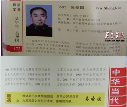 吳圣國,出生年月:1953年10月,祖籍:四川省鄰水縣鼎屏鎮(zhèn),現(xiàn)在住址:四川省鄰水縣鼎屏鎮(zhèn)上甲御城6棟31-5,職務:中校、四川廣安市副縣級干部,1974年12月在鄰水縣人武部應征入伍,1975年3月在成都警備區(qū)獨立二團炮兵連服役,任班長。1979年在軍隊院校學習,畢業(yè)后任國營五六五廠軍代表(正排職),1982年任副連職軍代表,1983年任總參駐重慶軍代處助理員,負責成都戰(zhàn)區(qū)彈藥生產軍工業(yè)務質檢工作,1985年調中國人民解放軍四川省鄰水縣人武部工作,1995年被成都軍區(qū)授予少校軍銜,1998年被成都軍區(qū)授予正營中校軍銜。1989年被達縣軍區(qū)分政治部、達縣地委武委會授予三等功。1999年轉業(yè)到地方工作,2014年被廣安市委組織部任命為副縣級干部。2015年3月退休。希望吳氏宗親加強團結,共同辦好吳氏事業(yè),為吳氏歷史資料的清理、整編做貢獻。
