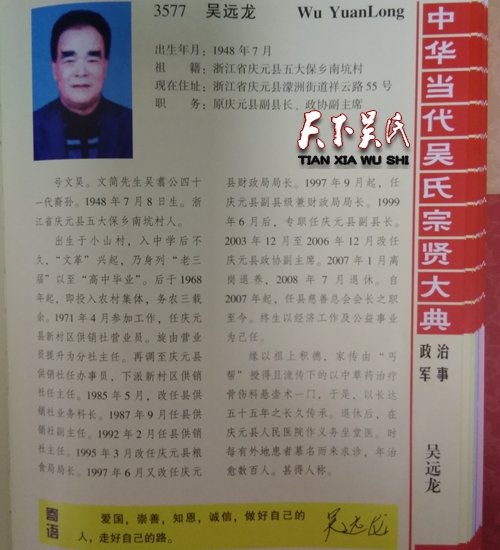 吳遠龍,出生年月:1948年7月,祖籍:浙江省慶元縣五大保鄉(xiāng)南坑村,現(xiàn)在住址:浙江省慶元縣濛洲街道祥云路55號,職務:原慶元縣副縣長、政協(xié)副主席,號文昊。文簡先生吳翥公四十一代裔孫。1948年7月8日生。浙江省慶元縣五大保鄉(xiāng)南坑村人。出生于小山村,入中學后不久,“文革”興起,乃身列“老三屆”以至“高中畢業(yè)”。后于1968年起,即投入農村集體,務農三載余。1971年4月參加工作,任慶元縣新村區(qū)供銷社營業(yè)員。旋由營業(yè)員提升為分社主任。再調至慶元縣供銷社任辦事員,下派新村區(qū)供銷社任主任。1985年5月,改任縣供銷社業(yè)務科長。1987年9月任縣供銷社副主任。1992年2月任縣供銷社主任。1995年3月改任慶元縣糧食局局長。1997年6月又改任慶元縣財政局局長。1997年9月起,任慶元縣副縣級兼財政局局長。1999年6月后,專職任慶元縣副縣長。2003年12月至2006年12月改任慶元縣政協(xié)副主席。2007年1月離崗退養(yǎng),2008年7月退休。自2007年起,任縣慈善總會會長之職至今。終生以經濟工作及公益事業(yè)為己任。緣以祖上積德,家傳由“丐幫”授得且流傳下的以中草藥治療骨傷科懸壺術一門,于是,以長達五十五年之長久傳承。退休后,在慶元縣人民醫(yī)院作義務坐堂醫(yī)。時每有外地患者慕名而來求診,年治愈數(shù)百人。甚得人稱。愛國,崇善,知恩,誠信,做好自己的人,走好自己的路。