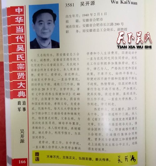 吳開源,出生年月:1940年2月1日,祖籍:安徽省合肥市,現(xiàn)在住址:安徽省合肥市長江路200號,職務:原安徽省總工會處長,副教授,又名錢傳水,原安徽省總工會處長、副教授。安徽省至德傳統(tǒng)文化交流中心名譽副主任,吳氏皖鄉(xiāng)宗親會終身名譽會長。本人秉承家教,愛學習,愛勞動,親近群眾。自幼至大學畢業(yè),一直品學兼優(yōu),擔任學生干部。通曉三門外語,翻譯作品20多萬字。自學中醫(yī),著有《中醫(yī)藥養(yǎng)生保健知識》近40萬字,出版著作30余本,獲省級和國家級獎勵。孝順父母,友愛親戚。饑餓年代,每天從大學飯食中扣下部分積三日遞給母親和妹妹充饑。物資匱乏時期,父親生病,為其四處求醫(yī)尋藥。嬸母早年寡居,弟妹幼小,本人按時資助,表嫂孀居,缺乏勞力,利用節(jié)假日,為其田間勞作。愛勞動,愛工作。自中學起,一直以勤工儉學收入和獎學金解決學費和個人生活費用。四清運動中一直與農民同吃同住同勞動,到機關工作后積極參加集體勞動。愛工作,律己為人,嚴格執(zhí)行黨和國家政策,不卑不亢,始終平等待人,即便對四不清干部和犯錯誤干部也不歧視,熱情幫助,但其對群眾危害行為也不決不姑息,嚴加教訓,使其反悔,改過自新。雖然退休,但工作不退,一直在大學執(zhí)教,工作到老,學習到老。熱愛群眾,仗義援手。21世紀頭十年,富士康連環(huán)十三跳,本人在《南方周方》連續(xù)發(fā)表兩篇署名文章,引起中共高層領導關注,推動全國兩個普遍,即普遍推行建立工會組織,普遍推行集體合同制度。曾多次為普通職工和弱勢群體走上法庭為其主張公平正義,均取得良好效果。不卑不亢,主張正義,弘揚至德,薪火傳承。