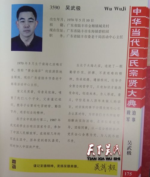 吳武極,出生年月:1970年5月10日,祖籍:廣東省陸豐市金廂鎮(zhèn)城美村,現(xiàn)在住址:廣東省陸豐市東海鎮(zhèn)碧桂園,職務:廣東省陸豐市委老干局活動中心主任,1970年5月生于南海之濱碣石灣,雅稱“黃金海岸”的旅游勝地金廂灘。現(xiàn)任廣東省陸豐市委老干部局活動中心主任。家父吳英豪,母親吳依妹,哺育了我們八個子女,父親謹記祖訓,教導子女要有吃苦耐勞、勤儉節(jié)約、艱苦創(chuàng)業(yè)的精神。在子女中我排行第二,1987年我完成學業(yè)后響應國家號召,參加了中國人民解放軍,在短短幾年的軍旅生涯中,歷年受到部隊嘉獎,同時加入中國共產黨。生長于大海之濱,造就了一顆勤勞樸實、拼搏、不畏艱難的精神,傳承祖德、遵循祖訓,引導子女努力刻苦學習,只有知識才能改變命運,創(chuàng)造未來。為人厚道,重義,守信是本人歷年來做人的宗旨,對宗族的事不計得失而盡心盡力認真對待,為宗親們力盡所能幫助解決實際困難,在單位尊重領導,團結同事,以一名合格的共產黨員全心全意為黨、為人民盡職盡責。謹記至德精神,發(fā)揚至德美德。
