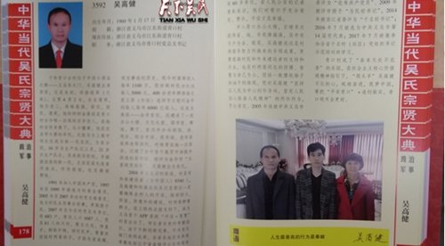 吳高健,出生年月:1960年1月17日,祖籍:浙江省義烏市江東街道青口村,現(xiàn)在住址:浙江省義烏市江東街道青口村,職務:浙江省義烏市青口村黨總支書記,千年青口古村位于中國小商品之都——義烏東大門。吳高健出身貧苦,父吳朱桓,母駱銀翠(已故)。生育4男2女,長女惠琴,他為老二,弟妹高強、榮位、榮民、惠英。他的奶奶金景球是青口村古今唯一出現(xiàn)的百歲老人,在她的言傳身教下,從小懂事。他在農業(yè)學大寨的年代,無能為力上高中而立志成為新一代農民,為家分憂。16歲當生產隊記工員,21歲任生產隊長,是肩挑貨郎擔,手搖撥浪鼓的新一代。尤其是深化改革開放后,件件樁樁,社員都稱贊他。1991年加入中國共產黨,1997年至1999年被選為村委會委員,2005年至2007年任村黨支部委員。他為村民辦實事辦好事,更取勝于民。2007年至今任村黨總支書記。有683戶,常住人口1687人、黨員81人的大村,需立大志,伸直手,賠鐵補鍋,傾聽民聲,尊重并團結村兩委班子,才能化繭成蝶。有志事成創(chuàng)歷史?,F(xiàn)今村集體收入每年1100萬,股份制村民分紅達每人5000元。400余老年群體每月發(fā)工資(補貼)連同節(jié)日慰問金平均每人每年6000元收入。這成為美談——全市首位。還建造了一流辦公大樓、文化禮堂、圖書室、舞池、舞廳、室內外乒乓球館、場、戲臺、綜合市場、夜市場、老年居家養(yǎng)老等場所。村體育設施一應俱全,還建了全市首個集貿市場提升改造的菜市場。被評為金華市“五星級黨組織”。吳高健出力非凡。2008年完成舊村改造。村里有外來建設者(含外國人)8540人,吳高健和村委主任吳漢忠商議一定要確保全村人的平安,做好防火、防盜、防意外的建設,村兩委群策群力,在上級的點撥支持下,成為義烏首個APP系統(tǒng)“平安+智慧”村居出臺了。市長親自來村考察指引。由于不斷創(chuàng)新完善,中央有關部門欣聞此舉。全省各地前來參觀考察包括遼寧省盤錦市公安局領導有60多單位,省人民公安的記者曾來采訪,他們對青口予充分肯定、贊許,平安才是幸福。步入青口辦公大樓,目睹多次獲得省、地、市獎牌滿滿,其中有不少為金、銀獎。吳高健說這是村兩委齊努力所換來的豐碩成果,更要感謝村民和外來建設者的支持和汗水。也是村兩委同志的拼搏、智慧與舍己為公,團結一致擼起袖子加油干的體現(xiàn)。黨對吳高健“堅持以人民為中心創(chuàng)作導向,堅定人民信心振奮人民精神”的所作所為,予以肯定。2005年他被中共義烏市委評為“優(yōu)秀共產黨員”、2009年被評市授予“為民好書記”,2014年被浙江省委評為“千名好書記”;2016年7月被選為中共義烏市第14屆黨代表;2017年7月被邀參加全省千名村(社區(qū))黨組織書記示范培訓班學習。青口村成了“春來無處不花香”的樂園,在社會主義核心價值觀精神指引下,“領頭羊”吳高健不忘初心,砥礪奮進,筑夢中國,要把“平安青口”+連創(chuàng)做實,青口明天會更好。