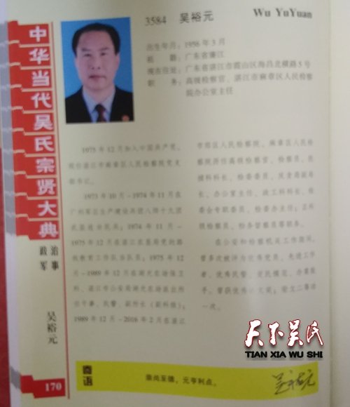吳裕元,出生年月:1956年3月,祖籍:廣東省廉江,現(xiàn)在住址:廣東省湛江市霞山區(qū)海昌北橫路5號,職務:高級檢察官、湛江市麻章區(qū)人民檢察院辦公室主任1975年12月加入屮國共產黨,現(xiàn)任湛江市麻章區(qū)人民檢察院黨支部書記。1973年10月-1974年11月在廣州軍區(qū)生產建設兵團八師十九團武裝連當民兵;1974年11月-1975年12月在湛江農墾局黨的路線教育工作隊當隊員;1975年12月-1989年12月在湖光農場保衛(wèi)科、湛江市公安局湖光農場派出所任干事、民警、副所長(副科級);1989年12月-2016年2月在湛江市郊區(qū)人民檢察院、麻章區(qū)人民檢察院歷任高級檢察官、檢察員、批捕科科長、檢委委員、反貪局副局長、辦公室主任、政工科科長、檢委會專職委員、檢委辦主任;正科級檢察員、檢務督察員等職務。在公安和檢察機關工作期間,曾多次被評為優(yōu)秀黨員、先進工作者、優(yōu)秀民警、愛民模范、辦案能手。曾獲優(yōu)秀論文獎;榮立二等功一次。
