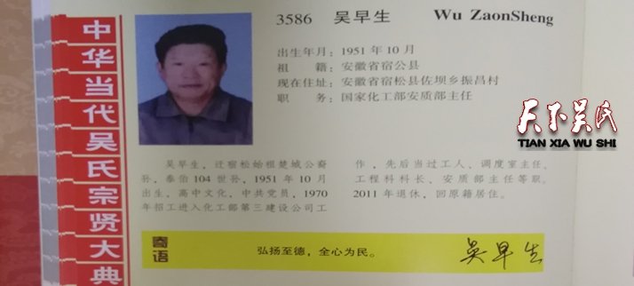 吳早生,出生年月:1951年10月,祖籍:安徽省宿公縣,現(xiàn)在住址:安徽省宿松縣佐壩鄉(xiāng)振昌村,職務:國家化工部安質部主任,吳早生,遷宿松始祖楚城公裔孫,泰伯104世孫,1951年10月出生,高中文化,中共黨員,1970年招工進入化工部第三建設公司工作 ,先后當過工人、調度室主任、工程科科長、安質部主任等職。2011年退休,回原籍居住。弘揚至德,全心為民。