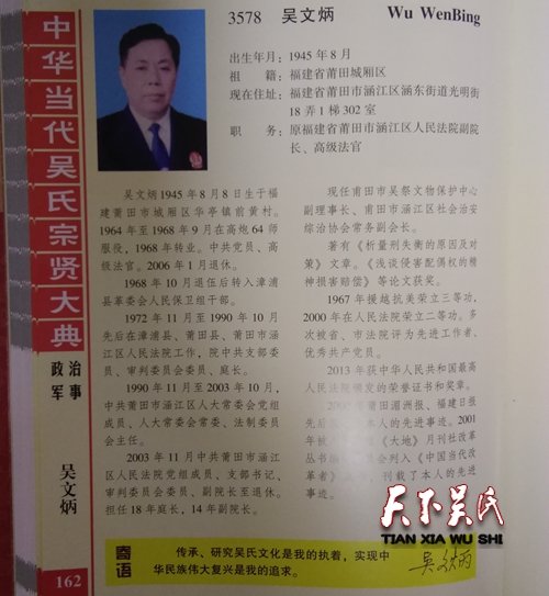 吳文炳,出生年月:1945年8月,祖籍:福建省莆田城廂區(qū),現(xiàn)在住址:福建省莆田市涵江區(qū)涵東街道光明街18弄1梯302室,職務:原福建省莆田市涵江區(qū)人民法院副院長、高級法官,吳文炳1945年8月8日生于福建莆田市城廂區(qū)華亭鎮(zhèn)前黃村。1964年至1968年9月在高炮64師服役,1968年轉業(yè)。中共黨員、高級法官。2006年1月退休。1968年10月退伍后轉入漳浦縣革委會人民保衛(wèi)組干部。1972年11月至1990年10月先后在漳浦縣、莆田縣、莆田市涵江區(qū)人民法院工作,院中共支部委員、審判委員會委員、庭長。1990年11月至2003年10月,中共莆田市涵江區(qū)人大常委會黨組成員、人大常委會常委、法制委員會主任。2003年11月中共莆田市涵江區(qū)人民法院黨組成員、支部書記、審判委員會委員、副院長至退休。擔任18年庭長,14年副院長。現(xiàn)任甫田市吳祭文物保護中心副理事長、甫田市涵江區(qū)社會治安綜治協(xié)會常務副會長。著有《析量刑失衡的原因及對策》文章。《淺談侵害配偶權的精神損害賠償》等論文獲獎。1967年援越抗美榮立三等功,2000年在人民法院榮立二等功。多次被省、市法院評為先進工作者、優(yōu)秀共產黨員。2013年獲中華人民共和國最高人民法院頒發(fā)的榮譽證書和獎章。2000年莆田湄洲報、福建日報先后報導了本人的先進事跡。2001年被人民日報《大地》月刊社改革叢書編輯委員會列入《中國當代改革者》叢書,刊載了本人的先進事跡。傳承、研究吳氏文化是我的執(zhí)著,實現(xiàn)中華民族偉大復興是我的追求。