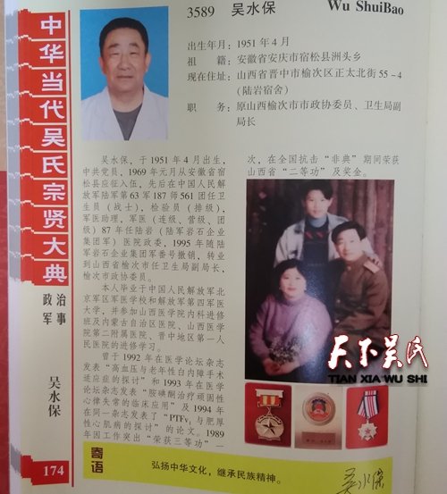 吳水保,出生年月:1951年4月,祖籍:安徽省安慶市宿松縣洲頭鄉(xiāng),現(xiàn)在住址:山西省晉中市榆次區(qū)正太北街55-4(陸巖宿舍),職務:原山西榆次市市政協(xié)委員、衛(wèi)生局副局長,吳水保,于1951年4月出生,中共黨員,1969年元月從安徽省宿松縣應征入伍,先后在中國人民解放軍陸軍第63軍187師561團任衛(wèi)生員(戰(zhàn)士),檢驗員(排級),軍醫(yī)助理,軍醫(yī)(連級、營級、團級)87年任陸巖(陸軍巖石企業(yè)集團軍)醫(yī)院政委,1995年隨陸軍巖石企業(yè)集團軍番號撤銷,轉業(yè)到山西省榆次市任衛(wèi)生局副局長,榆次市政協(xié)委員。,本人畢業(yè)于中國人民解放軍北京軍區(qū)軍醫(yī)學校和解放軍第四軍醫(yī)大學,并參加山西醫(yī)學院內科進修班及內蒙古自治區(qū)醫(yī)院、山西醫(yī)學院第二附屬醫(yī)院、晉中地區(qū)第一人民醫(yī)院的進修學習。曾于1992年在醫(yī)學論壇雜志發(fā)表“高血壓與老年性白內障手術適應癥的探討”和1993年在醫(yī)學論壇雜志發(fā)表“胺碘酮治療頑固性心律失常的臨床應用”及1994年在同一雜志發(fā)表了“PTFv1與肥厚性心肌病的探討”的論文。1989年因工作突出“榮獲三等功”一次,在全國抗擊“非典”期間榮獲山西省“二等功”及獎金。 弘揚中華文化,繼承民族精神。