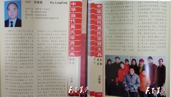 吳隆繁,出生年月:1956年1月26日,祖籍:湖北省大悟縣,現(xiàn)在住址:河南省信陽市,職務:河南省信陽煙草局退休干部,1956年1月26日生于湖北省大悟縣四姑墩大吳家,中共黨員,大專文化,泰伯第106世(為始遷祖吳萬七支系第22世)裔孫,湖北省吳氏至德文化發(fā)展有限公司執(zhí)行理事,大悟縣吳氏宗親聯(lián)誼理事會會長。熱愛家族事業(yè),為人公道正派,樂于奉獻,累計為家鄉(xiāng)(家族)事業(yè)建設發(fā)展奉獻善款8萬余元,并對吳萬七支系家族文化有較深的研究。另外,自費30多年對著名烈士吳紹鎰(楊松)革命生涯進行了深入研究。1978年在大悟縣參加工作, 1981年調河南省明港步兵第六十師后勤部軍工企業(yè)第9033工廠工作,先后任物資采購員、供銷科副科長、科長等職,助理經濟師職稱。 1989年春調信陽地區(qū)煙草系統(tǒng)工作,先后任信陽縣煙草專賣局(公司)業(yè)務科副科長、科長,信陽地區(qū)煙草局(公司)明港分局業(yè)務科長,羅山縣煙草局(公司)黨組成員、副經理,固始縣煙草局(公司)黨組成員、副經理,信陽市平橋煙草局(公司)黨組副書記兼紀檢組長、黨總支書記等職。曾先后任信陽縣第五屆、羅山縣六屆政協(xié)委員、固始縣第八屆政協(xié)常委。連續(xù)十多年被評為單位先進工作者?!缎抨柸請蟆芬浴堵毠さ暮卯敿胰?mdash;—吳隆繁》給予報道,被信陽地區(qū)煙草專賣局授予"信煙的脊梁"榮譽稱號。工作之余和退休之后,熱衷于黨史人物研究和吳氏家族根親文化研究,先后以本名或筆名在全國各地黨史報刊雜志和網(wǎng)絡上發(fā)表作品數(shù)十篇。為弘揚英烈的革命傳統(tǒng)精神,曾兩次接受《楚天都市報》的專訪,接受了《牡丹江日報》、《本溪日報》、《延安日報》等新聞媒體的訪談。搜集整理了楊松(吳紹鎰)烈士的圖文資料3000余份(張),撰寫了4萬多字的楊松革命事跡陳列展大綱;合著出版有《楊松傳》、主編《歷史的見證——楊松紀念文集》,征集匯編《紀念楊松同志誕辰110周年理論研討會論文選》。敬祖愛族,為家鄉(xiāng)建設盡心竭力。如出資協(xié)助村里安裝電話購置通訊設備、修建塘堰和鄉(xiāng)村水泥道路,推動并參與維修始遷祖萬七公墓、始祖母繞太君墓及長一公夫婦墓、三世祖榮三公夫婦墓,還分別資助維修四世祖思廣公墓、八世豪祖墓、十四世文秀公墓、十五世楷祖墓及本分支各先輩墓;十屆續(xù)修家譜慷慨解囊,擔任顧問、副主編和責任編輯,撰寫《續(xù)修家譜序》、《家族精神》、《吳氏家風》等十多位家族名人傳記,并搜集整理了卾北、豫南兩省的三世祖"四榮"后裔主要聚居地;同時,還幫助原散居在信陽市周邊的萬七公后裔尋根溯源,理順族支世派,促成了吳坤隆,茂成、績兵等200余人認祖歸宗,載入五世祖鈺公支系續(xù)宗合譜。正人倫,報祖恩,傳承先祖遺德,啟迪后世子孫,為吳氏家族根親文化研究永不止步。