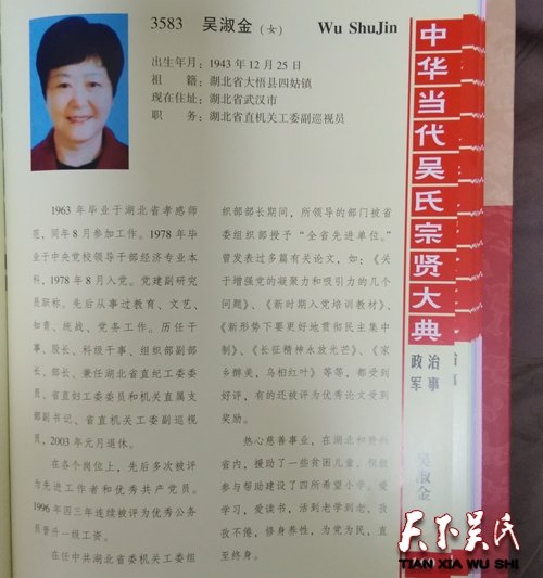 吳淑金,出生年月:1943年12月25日,祖籍:湖北省大悟縣四姑鎮(zhèn),現(xiàn)在住址:湖北省武漢市,職務:湖北省直機關工委副巡視員1963年畢業(yè)于湖北省孝感師范,同年8月參加工作。1978年畢業(yè)于中央黨校領導干部經濟專業(yè)本科,1978年8月入黨。黨建副研究員職稱。先后從事過教育、文藝、知青、統(tǒng)戰(zhàn)、黨務工作。歷任干事、股長、科級干事、組織部副部長、部長、兼任湖北省直紀工委委員、省直婦工委委員和機關直屬支部副書記、省直機關工委副巡視員,2003年元月退休。在各個崗位上,先后多次被評為先進工作者和優(yōu)秀共產黨員。1996年因三年連續(xù)被評為優(yōu)秀公務員晉升一級工資。在任中共湖北省委機關工委組織部部長期間,所領導的部門被省委組織部授予“全省先進單位。”曾發(fā)表過多篇有關論文,如:《關于增強黨的凝聚力和吸引力的幾個問題》、《新時期入黨培訓教材》、《新形勢下要更好地貫徹民主集中制》、《長征精神永放光芒》、《家鄉(xiāng)醉美,烏桕紅葉》等等,都受到好評,有的還被評為優(yōu)秀論文受到獎勵。熱心慈善事業(yè),在湖北和貴州省內,援助了一些貧困兒童,積極參與幫助建設了四所希望小學。愛學習,愛讀書,活到老學到老,孜孜不倦,修身養(yǎng)性,為黨為民,直至終身。
