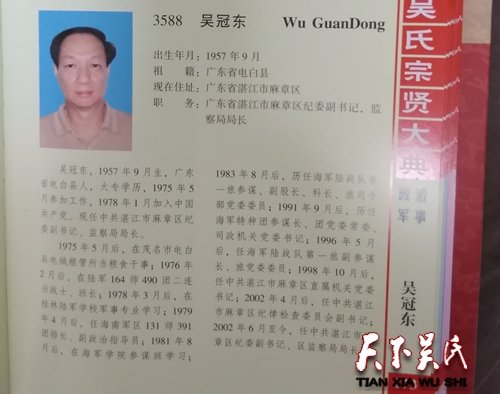 ⑿吳冠 東廣東省湛江市麻章區(qū)紀委副書記,監(jiān)察局局長吳冠東