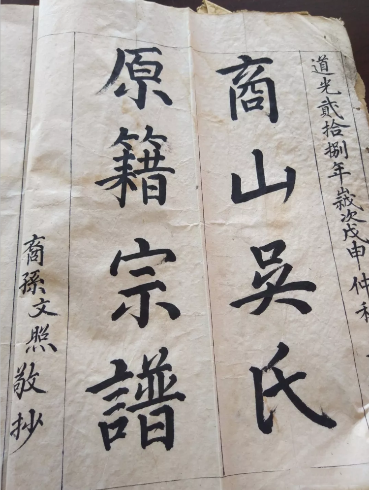 北,他們個(gè)個(gè)拉著我的雙手,久久不肯放下。問(wèn)我們先祖遷出的年代,問(wèn)我們的支系繁衍……,還帶我看了祖上700多年前所屬的九房祠遺址。在村辦公室,商山鎮(zhèn)的干部及村黨支部書(shū)記陳德平、村干部胡國(guó)剛、吳新喜等正在迎接我們的到來(lái)。宗親吳祖興把家里珍藏的《商山吳氏原籍宗譜》也拿到這里,讓我觀覽、拍照。商山鎮(zhèn)及雙橋村的領(lǐng)導(dǎo)們還要求我介紹了天門(mén)吳氏的有關(guān)情況,并邀我題寫(xiě)了“根深蒂固”四個(gè)大字以作紀(jì)念。