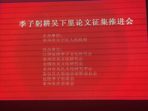 由常州市天寧區(qū)人民政府主辦,泰伯吳氏祖地宗親聯(lián)誼總會(huì)、延陵季子宗親會(huì)、常州吳氏宗親會(huì)、常州市吳文化研究會(huì)、無錫市吳文化研究會(huì)、蘇州市吳氏文化研究中心、江陰延陵季子文化研究會(huì)、常州市武進(jìn)季子文化研究會(huì)等協(xié)辦,將于年內(nèi)舉行”季子躬耕吳下里“論證會(huì)。