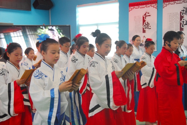 活動(dòng)中,30名學(xué)生代表和6名教師代表身著古典服飾,上臺(tái)齊誦《中華家訓(xùn)》,臺(tái)下200名師生跟聲頌讀,共憶先祖。中華文化的千年魅力頓時(shí)感染全場每一位人員。
