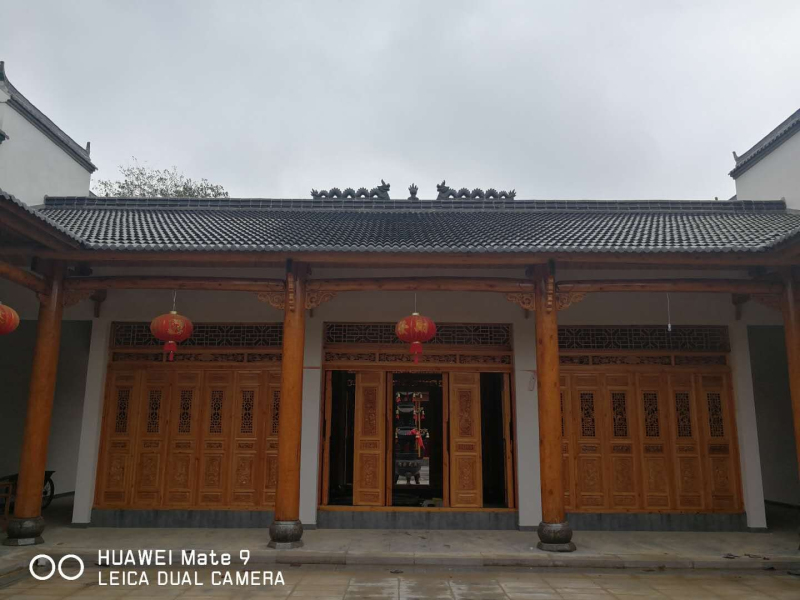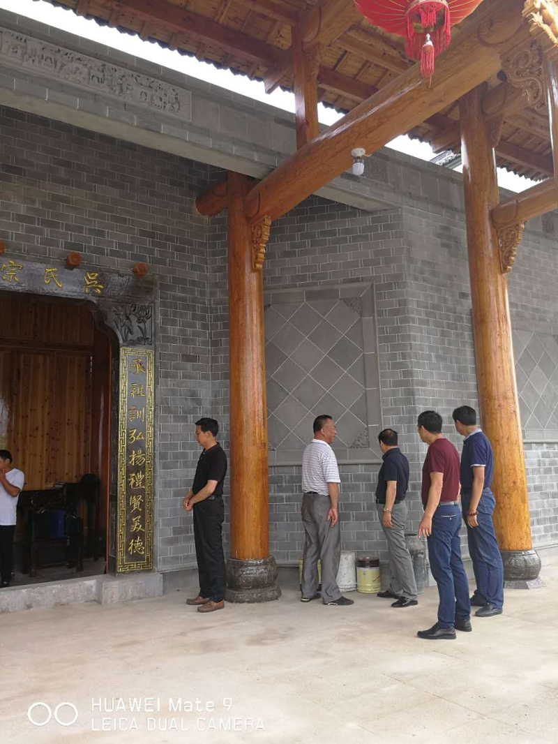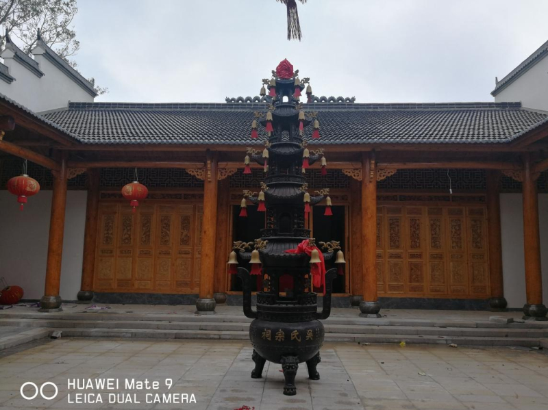 已涂刷完清漆的宗祠門梁柱、裝修好的兩邊回廊、中殿及院落、后殿大廳。粉墻黛瓦的微式建筑風(fēng)格,建筑面積近千平米。雖說(shuō)是三進(jìn),可那莊嚴(yán)、精致仍不失為一大特色,合抱粗的松木柱梁,外門兩旁徴派特色的磚雕技術(shù)與根雕之鄉(xiāng)的工藝完美結(jié)合,均來(lái)自永華宗長(zhǎng)的高超技術(shù)監(jiān)理和指導(dǎo)。二殿院落中間,擺放著鑄有蕪湖鑄造字樣的、吳家女婿魏氏捐贈(zèng)的兩米多高的香爐,襯托著中殿更加氣勢(shì)恢宏。兩邊回廊布局相當(dāng)合理、玲瓏小巧,給人以耳目一新之感。拜訪組一行,邊走邊看,不時(shí)駐足詢問(wèn)。陪同的宗親對(duì)設(shè)計(jì)投標(biāo)、材料采購(gòu)、施工、質(zhì)量、進(jìn)度、安全、資金籌措等一一作了介紹。一千平米的建筑面積,足足花了40多分鐘。