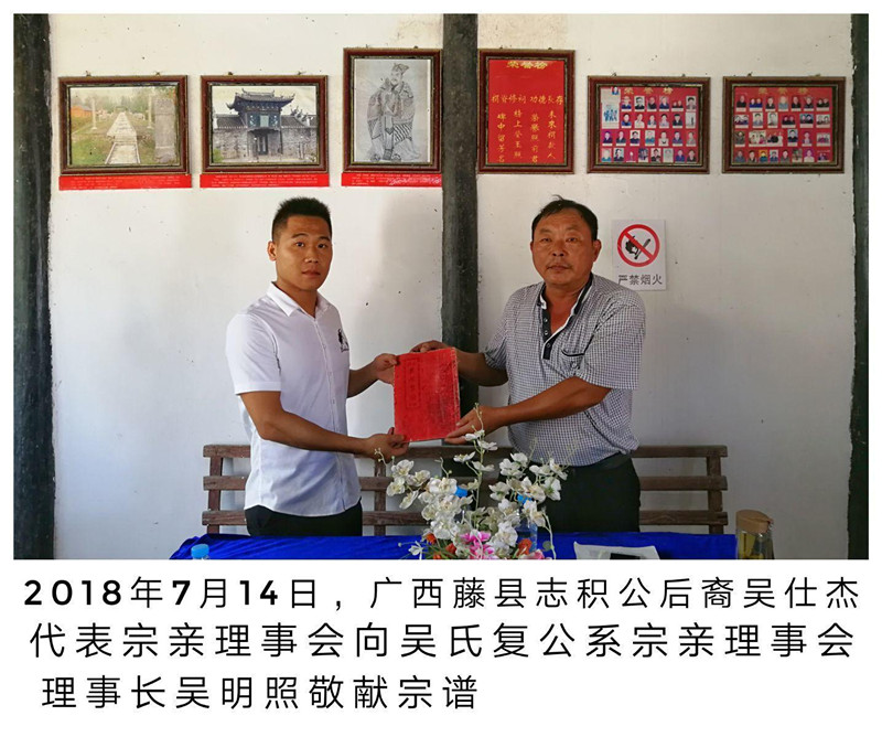 會后,吳仕杰代表藤縣宗親理事會向國公祠敬獻宗譜,皖湘黔吳氏復公系宗親理事會理事長吳明照接收宗譜。