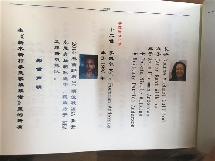 一邊人講著客家話,一邊人講著英語,親人相見,有著說不完道不盡的話語。最后,李天平代表李氏家族向安德森贈送了李氏家譜,表示正式接納了這位親人,并在扉頁上寫下了“歡迎回家”的中文字。凱爾·安德森向這位年長的表哥贈送了自己效力于馬刺隊(duì)的一件簽名球衣。