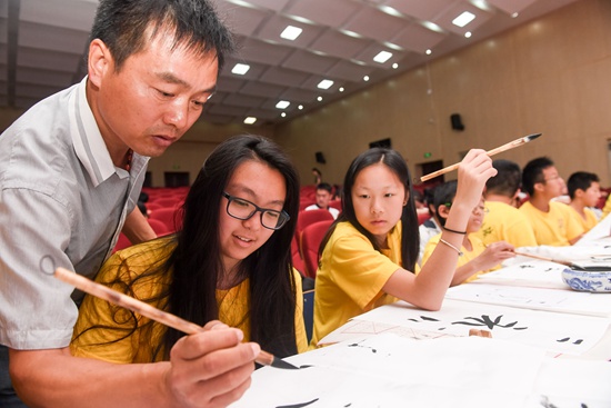 7月28日,在開營(yíng)儀式上,馬鞍山市第二十二中學(xué)的老師高宏修(左一)在教華裔青少年書法。 當(dāng)日,2018年海外華裔青少年“中國(guó)尋根之旅”夏令營(yíng)安徽營(yíng)在安徽省馬鞍山市開營(yíng),55名來自美國(guó)的華裔青少年將在9天的活動(dòng)中,學(xué)習(xí)書法、地方戲曲和民族舞蹈等課程,感受中華傳統(tǒng)文化的魅力。新華社記者 張端/攝