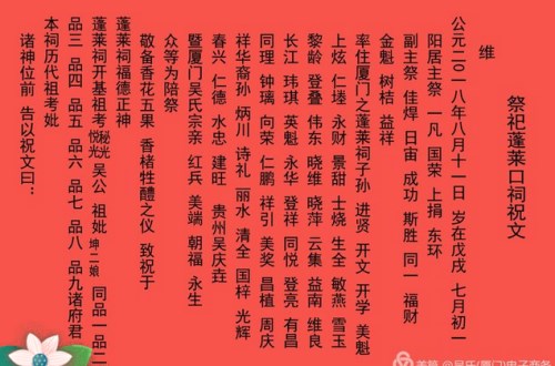 再是蓬萊口(廈門)吳氏宗親會(huì)全體宗親凝結(jié)的祖德圣緣是分不開的;希望蓬萊口祠每年祭祖慶典活動(dòng)都將突破空前;希望蓬萊口祠的裔孫們青出于藍(lán)而勝于藍(lán);希望蓬萊口祠的所有宗親家家幸福、戶戶平安建設(shè)更加美好的家園!