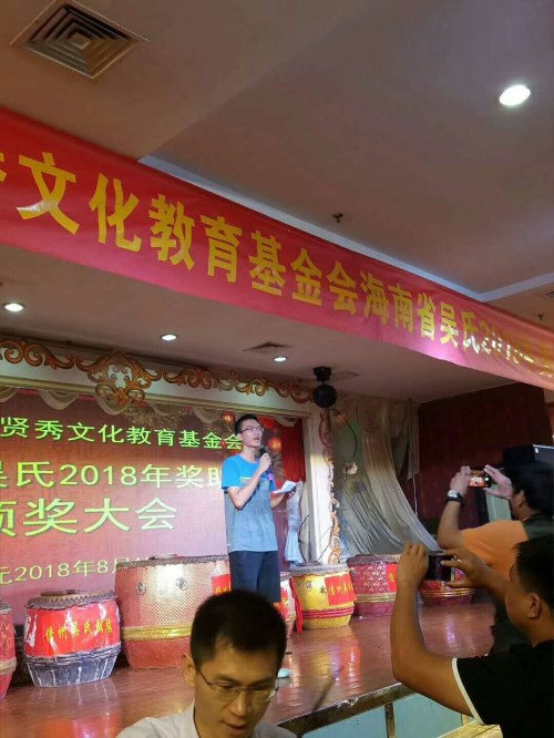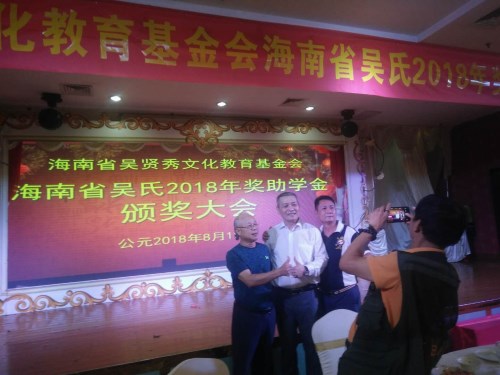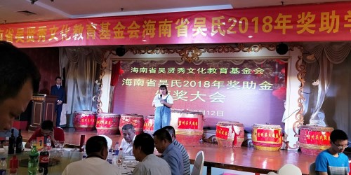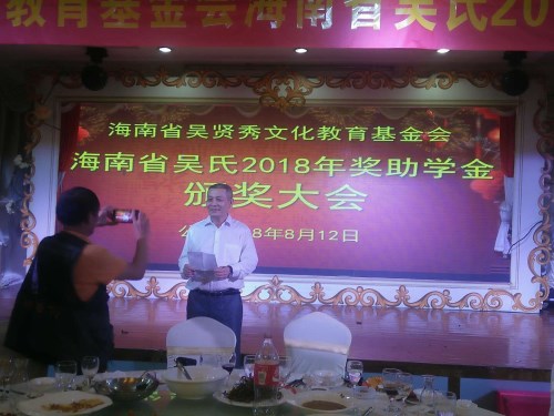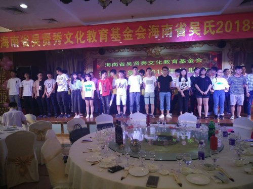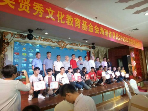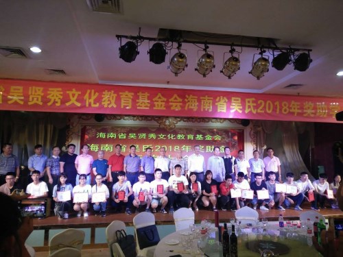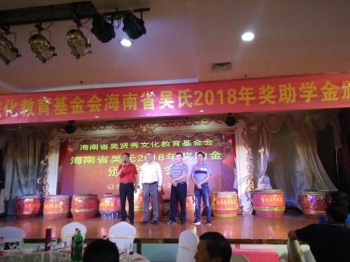 ( 吳開(kāi)河、吳冠儒、吳崇高來(lái)稿)2018年8月12日,海南省吳氏獎(jiǎng)助學(xué)金頒獎(jiǎng)大會(huì)在??阱\鴻溫泉大酒店舉行。來(lái)自海南吳賢秀文化教育基金會(huì)領(lǐng)導(dǎo)班子理事長(zhǎng):吳清東;副理事長(zhǎng):吳亞周、吳川富、吳曉明;秘書(shū)長(zhǎng):吳開(kāi)河;永遠(yuǎn)名譽(yù)理事長(zhǎng):吳亞榮;海南吳氏各市縣公會(huì)代表和全省各市縣獲得獎(jiǎng)助的150多名吳氏學(xué)子及家長(zhǎng)。其中15位同學(xué)考取中國(guó)名牌院校,獲得獎(jiǎng)學(xué)金4000--10000元/人,130位同學(xué)獲得助學(xué)金3000元。