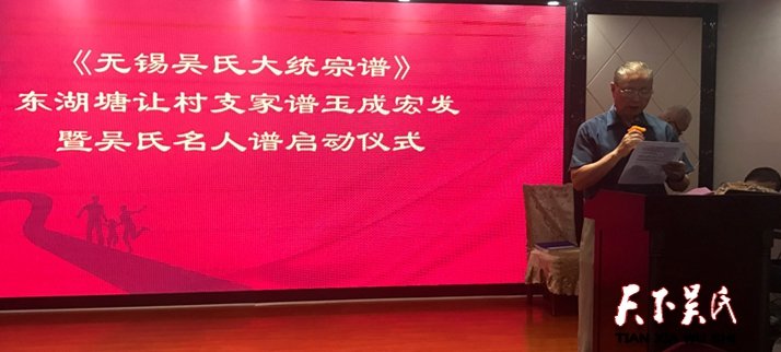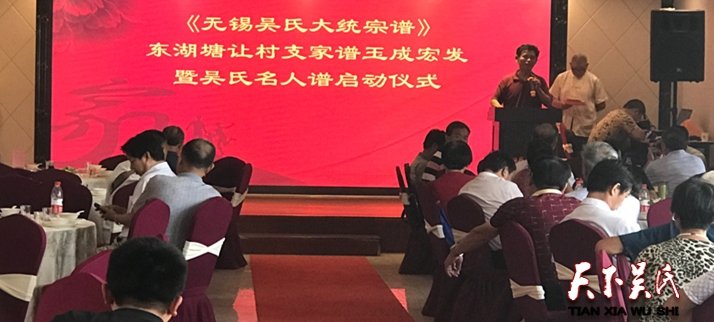 這次發(fā)譜儀式由《無錫吳氏大統(tǒng)宗譜》編委會(huì)常務(wù)副會(huì)長(zhǎng)吳士德宗長(zhǎng)主持。由泰伯吳氏祖地宗親聯(lián)誼總會(huì)會(huì)長(zhǎng)吳立興致賀辭!無錫市吳文化研究會(huì)董事長(zhǎng)兼常務(wù)副會(huì)長(zhǎng)、無錫吳氏祖地宗親會(huì)會(huì)長(zhǎng)吳仁山作工作報(bào)告、無錫市圖書館文史辦公室主任王進(jìn)雄等領(lǐng)導(dǎo)上臺(tái)作重要講話,對(duì)本次修譜成功表示祝賀,對(duì)無錫吳氏祖地宗親會(huì)和編委會(huì)全力組織續(xù)修族譜工作予以肯定。